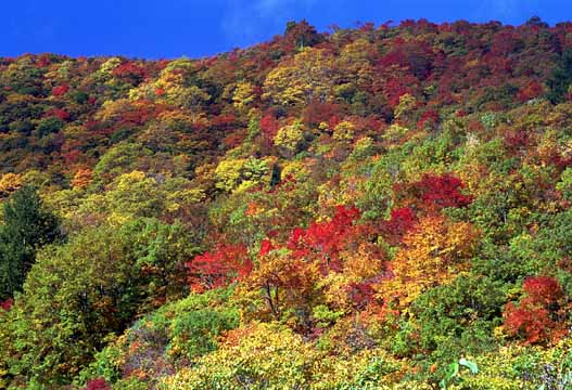 色とりどりに葉の色を変えた山と青い空。秋ですねぇ