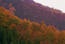山の中腹の彩りに夕日があたると黄色味が増し、唐松などは 黄金色に輝きだします。
