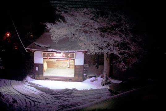 私の部屋の窓から見た雪の夜の光景です。 子供の頃からずっと見つづけてきた光景です。